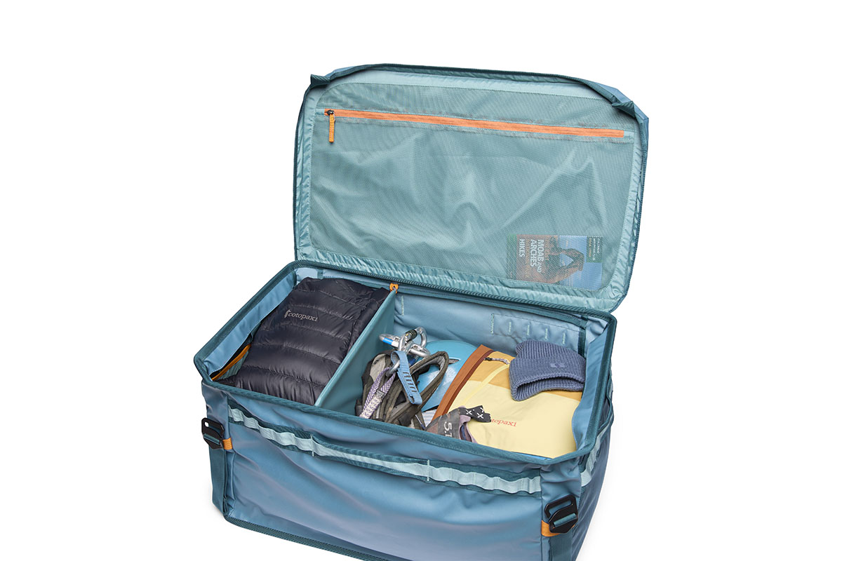 サイズは60L(56×39×33cm)と90L(66×43×35.5cm)で、90Lにはフレキシブルに取り付け可能な仕切り板が付属。側面の4面にはデイジーチェーン、フタ蓋の裏側にメッシュ素材のジッパーポケット、内側の左右にメッシュ素材のスリーブポケットなど、豊富な収納を備えている。