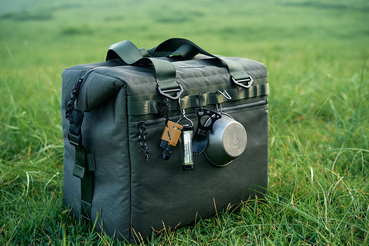 そしてもう1つは、登山や普段使いも想定したコンパクトサイズのソフトクーラー「MINI COOLER BAG PRO」。Mサイズ(15×24×19cm/¥8,250)と、平らな形状のLサイズ(24×24 ×11.5cm/¥8,800)の2サイズ展開でカラーは、アンヴィルグレー、カーキ、チャコールの3色展開になっている。