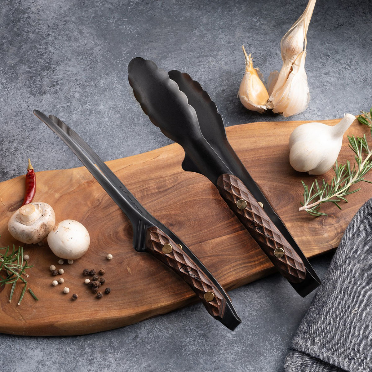 フェデカのトングといえば、菜箸のように繊細な盛り付けを得意とし、累計販売数6万本を超える大ヒット作「FEDECA CLEVER TONG」が人気。「つかみのトング」は、その相棒として、分厚い肉も逃さないホールド力と、手にフィットする3Dウッドハンドルを備えた新作。2つ揃えることで、あらゆる食材を意のままに操るトングの「二刀流」スタイルを提案している。
